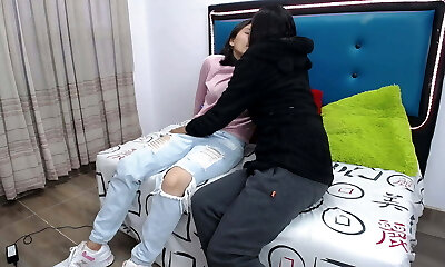 She tests him during a job a dialogue by sitting on a trouser snake