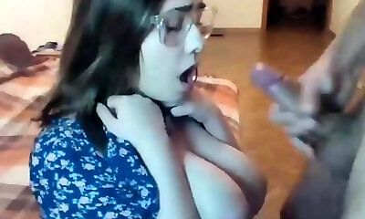 Amateur brunette with monstrous glasses knows how to treat a rock hard dick and make it explode