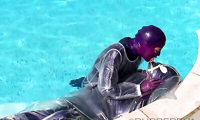 Condom Girl Fucked With Dildo In Transparent Latex Catsuit + Mask + Gloves