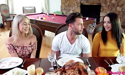 Smallish titted, towheaded honey is getting banged during a family lunch and eating pussy along the way