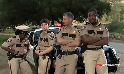 Pretty police woman attracted to a dark-hued male counterpart getting cozy at the station